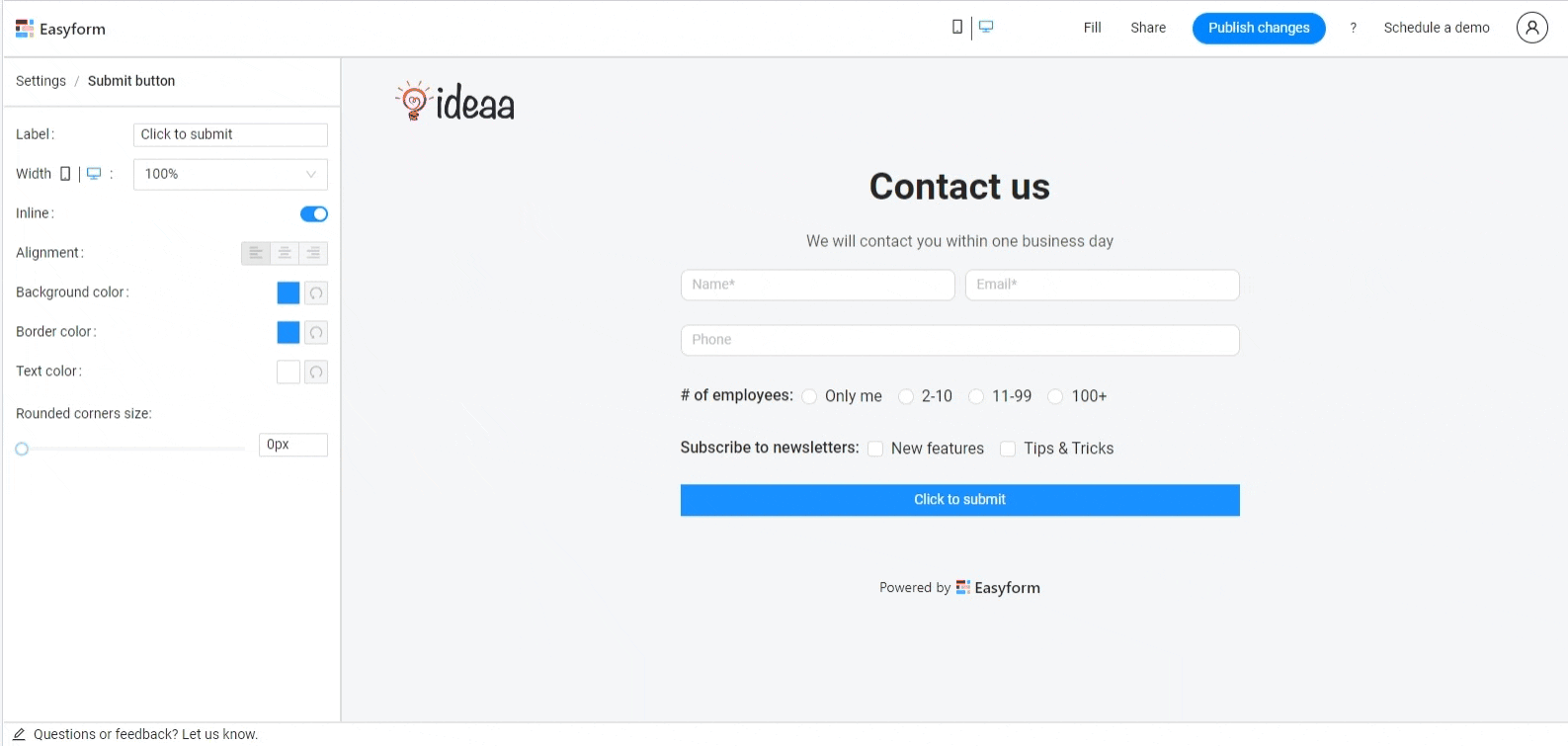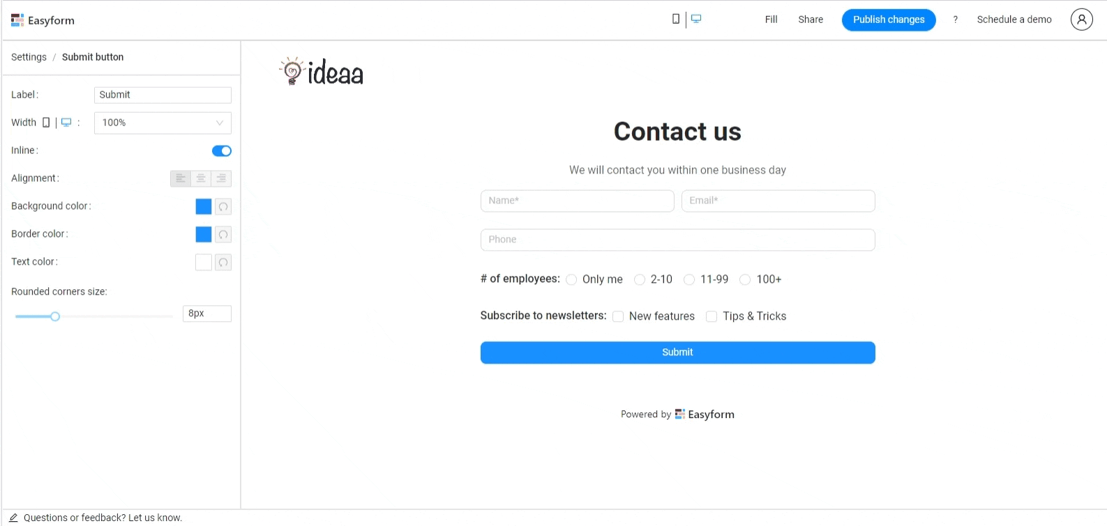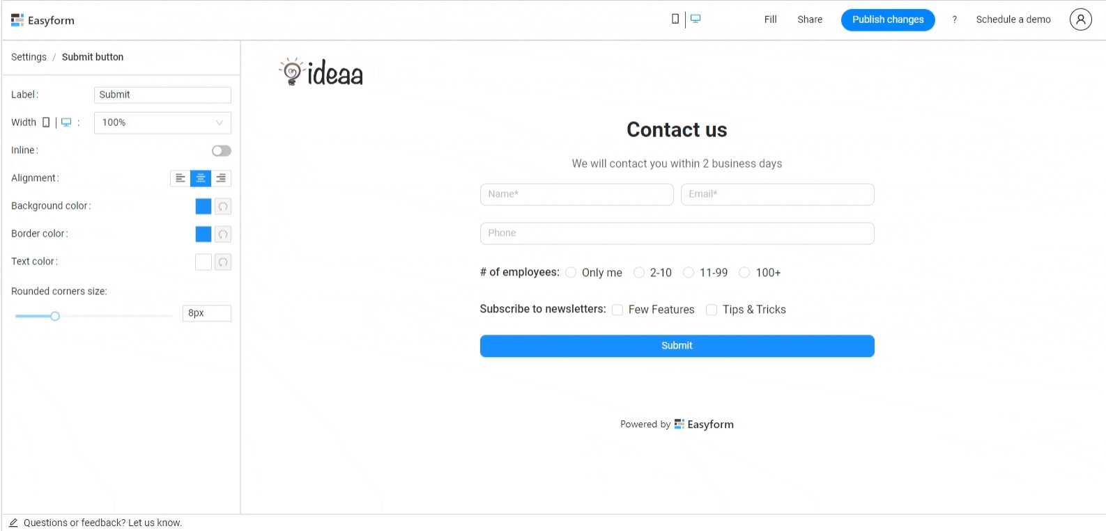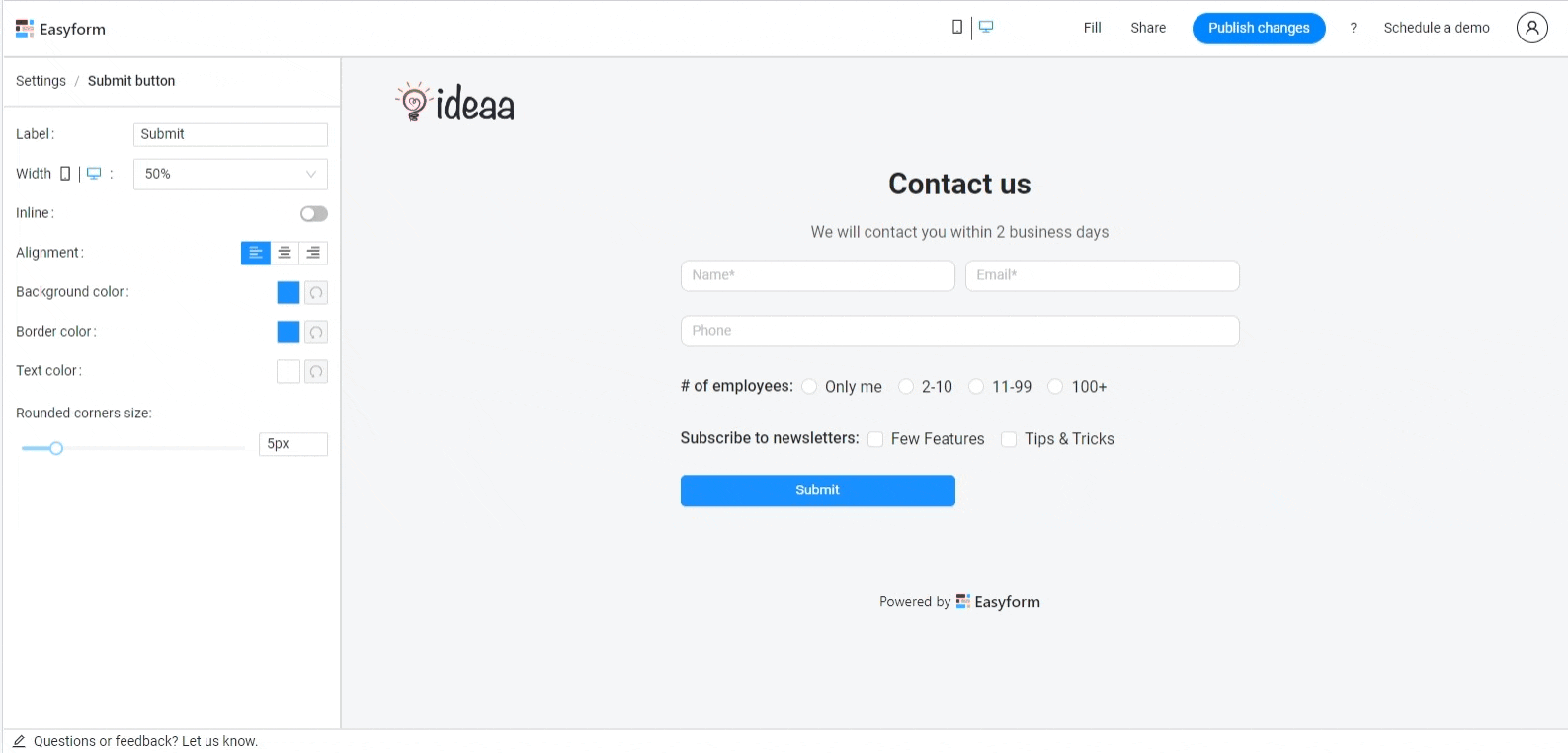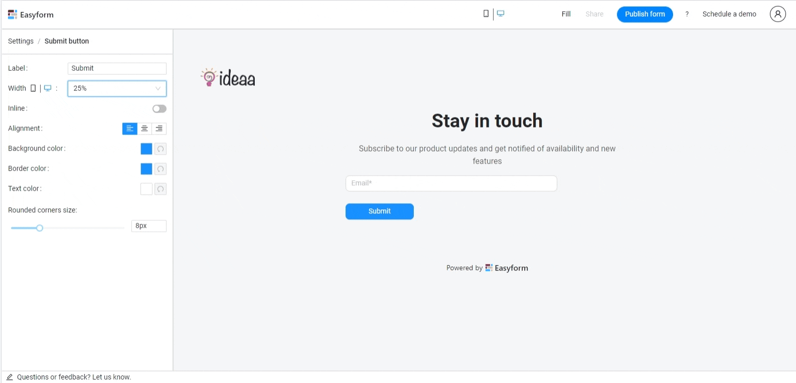 To make your form's buttons more or less round, use the slider or enter a number for the rounded corners size in pixels.