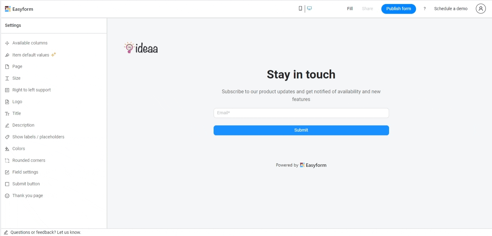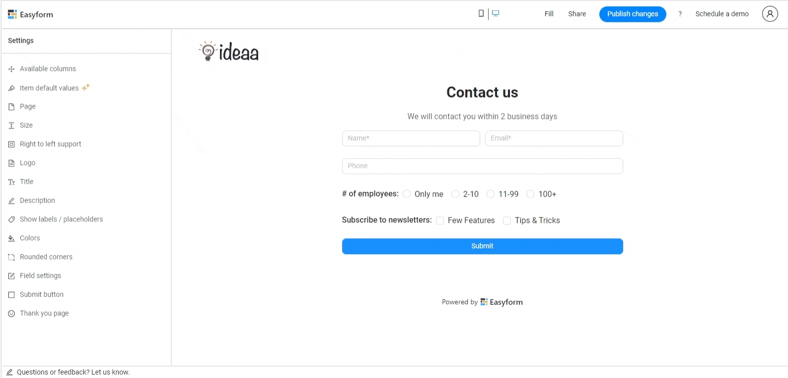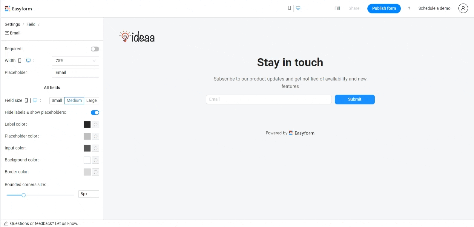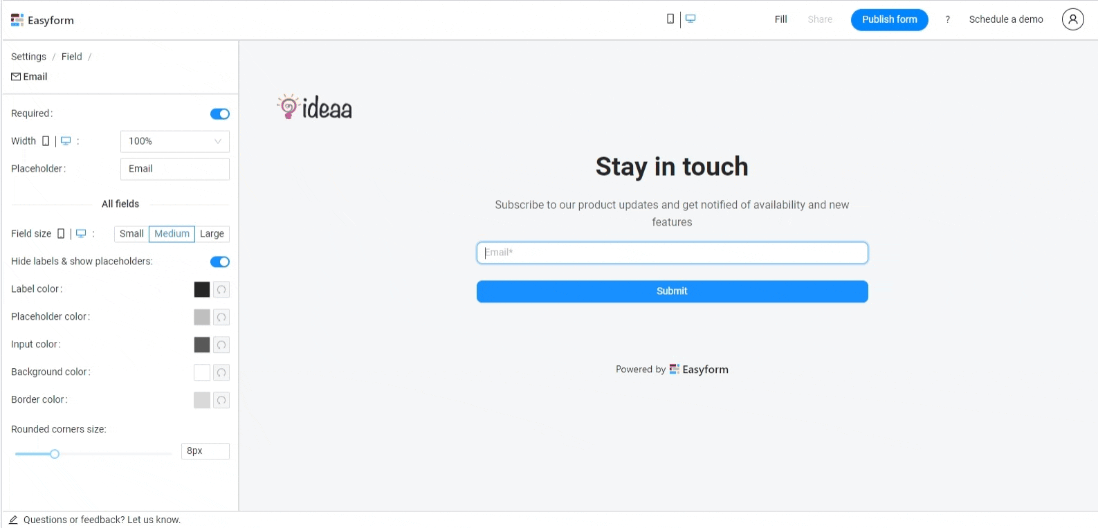 To make your form's buttons more or less round, use the slider or enter a number for the rounded corners size in pixels.